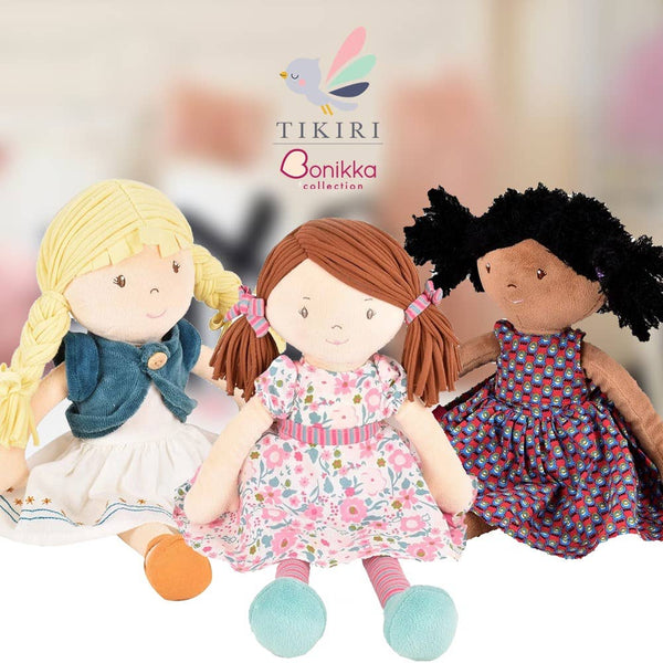 Features: Soft body rag doll with embroidered facial features and printed clothing.